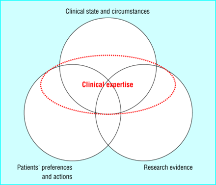 The circles in this diagram are ordered based on importance- with patient preferences and actions being most important and research evidence being the least important when practicing EBM. You can see that clinical expertise is used to tie it all together and decide on what should be done, not what could be done.