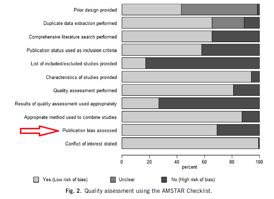 Onishi and Furukawa’s study is the first study to examine the frequency of significant publication bias in systematic reviews published in high impact factor general medical journals. They identified 116 systematic reviews published in the top 10 general medical journals in 2011 and 2012: NEJM, Lancet, JAMA, Annals of Internal Medicine, PLOS Medicine, BMJ, Archives of Internal Medicine, CMAJ, BMC Medicine, and Mayo Clinic Proceedings. They assessed each of the systematic reviews that did not report an assessment of publication bias for publication bias using Egger test of funnel plot asymmetry, contour-enhanced funnel plots, and tunnel effects. RESULTS: The included systematic reviews were of moderate quality as shown in the graph below. About a third of “systematic reviews” didn’t even perform a comprehensive literature search while 20% didn’t assess study quality. Finally, 31% of systematic reviews didn’t assess for publication bias. How can you call your review a systematic review when you don’t perform a comprehensive literature search and you don’t determine if you missed studies?